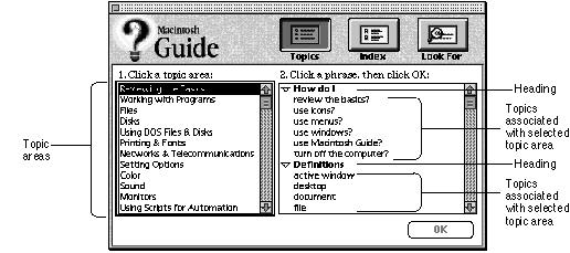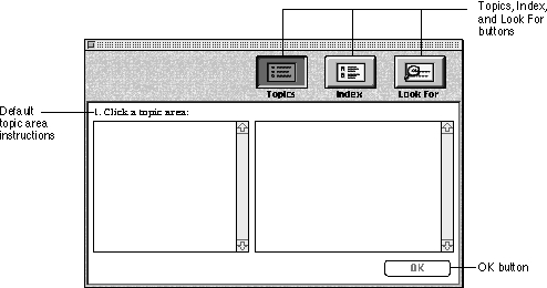 - Topic, Index, or Look For instructions, above the left and right columns of the window, that tell the user how to use respective features