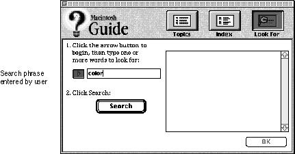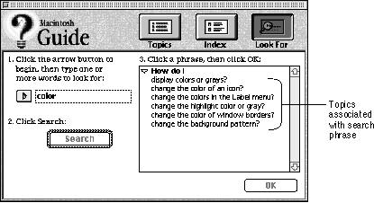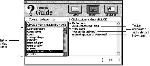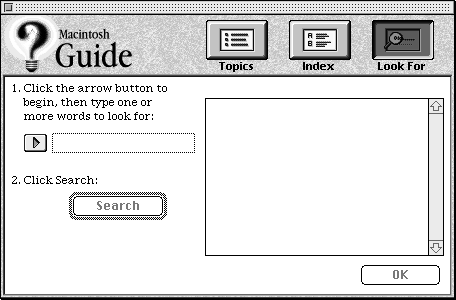 - Use the Full Access window if your guide file has more than 20 topics and must contain subtopics. You should also use it if you plan to incorporate the Apple Guide Look For and Index features described later in this section.The Full Access window provides three built-in buttons--Topics, Index, and Look For--from which the user makes selections or enters a search phrase.