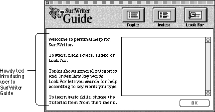Howdy text is text that you can place on the access window of a guide file to describe its contents. It appears the first time the user invokes the guide file and does not appear again unless the user restarts the computer.Apple recommends that you use howdy text to convey only crucial information to the user. For example, if you include both a general and an advanced help guide with your application, you can use howdy text to indicate the expertise level for each of them. You can also use howdy text to welcome the user to the help guide file and give initial instructions on its use.