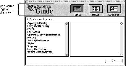 The next section explains how to design your application logo or title. Next come sections that explain how the Topics, Index, and Look For searching features work and how you need to implement them.