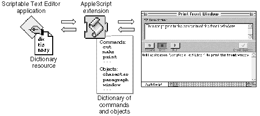 a statement, the AppleScript extension gets the dictionary resource for the application and reads its dictionary of commands, objects, and other words. Every scriptable application has a dictionary resource that defines the commands, objects, and other words script writers can use in scripts to control the application. Figure 2-2 shows how AppleScript gets the words in the Scriptable Text Editor's dictionary.Figure 2-2 How AppleScript gets the Scriptable Text Editor dictionary