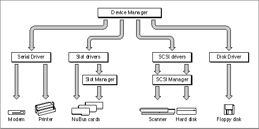 Devices communicate with applications and with the Operating System through special programs called device drivers. A device driver typically controls a specific hardware device, such as a modem, hard disk, or printer. This type of device driver acts as a translator, converting software requests into hardware actions and hardware actions into software results. Figure 1-1 illustrates some of the hardware devices that communicate with the Macintosh through device drivers.