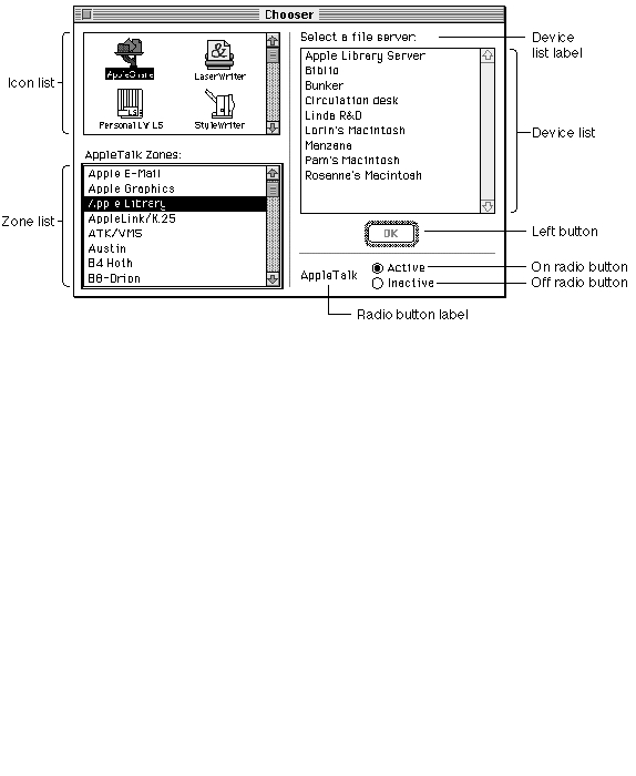 device-related choices. Typically, users select a type of device from the icon list, then select the particular device they want to use from the device list. For AppleTalk devices, the user must also select an AppleTalk zone from the zone list. The Chooser window can also display buttons, such as an OK button; and radio buttons, such as the background printing On and Off buttons. Figure 1-10 shows an example of the Chooser window.Figure 1-10 The Chooser window