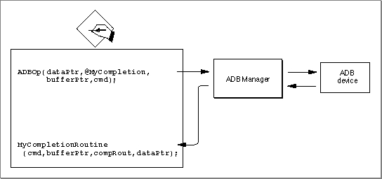 ADBOpfunction is always executed asynchronously. If the bus is busy, the ADB command passed toADBOpis held in a command queue until the bus is free. If your application requires synchronous behavior, you'll need to use a completion routine to determine when the ADB command itself has completed. Figure 5-11 shows the relationships between theADBOproutine, the device to which it is directly communicating, the ADB Manager, and an ADB completion routine.Figure 5-11 The