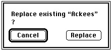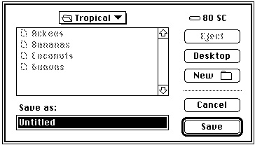 FUNCTION DoSaveAsCmd: OSErr; VAR myWindow: WindowPtr; {pointer to the front window} myData: MyDocRecHnd; {handle to a document record} myReply: StandardFileReply; myFile: Integer; {file reference number} myErr: OSErr; BEGIN myWindow := FrontWindow; {get front window and its data} myData := MyDocRecHnd(GetWRefCon(myWindow)); myErr := noErr; StandardPutFile('Save as:', 'Untitled', myReply); IF myReply.sfGood THEN {user saves file} BEGIN IF NOT myReply.sfReplacing THEN myErr := FSpCreate(myReply.sfFile, 'MYAP', 'TEXT', smSystemScript); IF myErr <> noErr THEN Exit(DoSaveAsCmd); myData^^.fileFSSpec := myReply.sfFile; IF myData^^.fileRefNum <> 0 THEN {if window already has a file} myErr := FSClose(myData^^.fileRefNum);{close it} {Create document's resource fork and copy Finder resources to it.} FSpCreateResFile(myData^^.fileFSSpec, 'MYAP', 'TEXT', smSystemScript); myErr := ResError; IF myErr = noErr THEN myFile := FSpOpenResFile(myData^^.fileFSSpec, fsRdWrPerm); IF myFile > 0 THEN {copy Finder resources} myErr := DoCopyResource('STR ', -16396, gAppsResFile, myFile) ELSE myErr := ResError; IF myErr = noErr THEN myErr := FSClose(myFile); {close the resource fork} {Open data fork and leave it open.} IF myErr = noErr THEN myErr := FSpOpenDF(myData^^.fileFSSpec, fsRdWrPerm, myFile); IF myErr = noErr THEN BEGIN myData^^.fileRefNum := myFile; SetWTitle(myWindow, myReply.sfFile.name); myErr := DoWriteFile(myWindow); END; DoSaveAsCmd := myErr; END; END;TheStandardPutFileprocedure is similar to theStandardGetFileprocedure discussed earlier in this chapter. It manages the user interface for the default Save dialog box, illustrated in Figure 1-8.Figure 1-8 The default Save dialog box