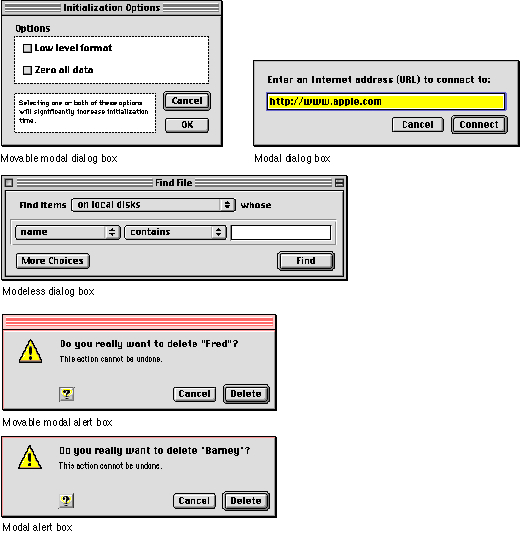 There are five types of dialog boxes available through the Mac OS Toolbox:
