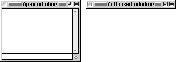 One of the new features of Mac OS 8 is the collapse box, shown in Figure 5-3. When the user clicks the collapse box, the content region of the window disappears, but the title bar remains visible and active. Clicking the collapse box again restores the window to its normal state. Opening and collapsing actions are normally accompanied by a sound, but this can be disabled by the user through the Appearance control panel. Figure 5-6 shows a window in its normal and collapsed states.Figure 5-6 Window in normal and collapsed states