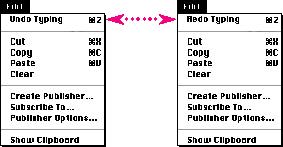 The Clipboard is available to all applications. Your application can show the contents of the Clipboard in a window. The Clipboard window looks and acts like a document window. The contents are visible, but not editable. Every time the user selects data in the active document and chooses Cut or Copy, store a copy of the selection in the Clipboard, replacing any previous Clipboard contents. Keep the previous contents available in case the user chooses Undo. Implement the Show Clipboard/Hide Clipboard command in the Edit menu so that the user can display and close the Clipboard window. If the Clipboard is already showing, the user can also use the close box or the Close command to close the window. Show Clipboard and Hide Clipboard are a single toggled item. The Show Clipboard/Hide Clipboard command is described in"Show Clipboard/Hide Clipboard" on page 91. You should let the user determine when the Clipboard window is open. For example, if the user leaves the window open when quitting your application, the Clipboard should be open when the user restarts it. In the cooperative, multitasking environment of the current system software, it's important that you hide your application's Clipboard window when your application is not active. In this model, each application has a local Clipboard. Whenever the user switches applications, the contents of the Clipboard are converted to a standard format. Undo/RedoThe Undo command reverses the effect of the user's previous operation. The Redo command reverses the effect of the last Undo command. Undo and Redo are a single toggled item. In most applications, there is one level of undo operations. The application determines which operations can be undone. Simple operations require your application to store a minimal amount of information about the previous state of the data in order to implement the Undo command. For example, if a user cuts one word from a document, you only need to store the size, the location, the content, and the style of the data. For operations that require you to store the entire state of the document in order to implement the Undo command, it may be more difficult to implement. You should consider the needs of your audience when making difficult decisions about which operations support the Undo command. Remember that your application must be able to redo every undo operation.In general, support the Undo command for operations that change the user's contents of a document. It's nice, but not necessary, to support the Undo command for operations that don't change the user's contents of a document. Actions that take a lot of effort to recreate are probably those that a user would most expect to be able to undo. For example, a user might spend several minutes arranging windows on a screen in a specific layout. If that user then accidentally chose the Tile command, the user would expect to be able to recover the original layout by using the Undo command. Most menu items, regardless of how the user invokes them, should be undoable. Most keyboard input, any sequence of characters typed from the keyboard or numeric keypad, including Delete (Backspace), Return, and Tab should also be undoable. Operations that may not be undoable include selecting, scrolling, splitting the window, or changing a window's size or location. None of these operations interrupts a typing sequence. For example, if the user types a few characters and then scrolls the document, the Undo operation doesn't undo the scrolling but does undo the typing. Whenever the location affected by the Undo command isn't currently showing on the screen, your application should scroll the document so the user can see the effect of the Undo command. You should add the name of the last operation to the Undo command. For example, it could read Undo Typing if the user just finished entering some text in a document. If the last operation can't be undone, you should use the phrase Can't Undo and display it dimmed, because it provides more feedback to the user about the current state. The Undo command changes to Redo after the user chooses Undo. You should also include the operation name in the Redo string when possible. If the user chooses Redo, reverse the undo operation. Figure 4-77 shows an example of the Edit menu with correctly updated Undo and Redo commands. Figure 4-77 The Undo and Redo commands