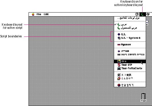 The Keyboard MenuUsers can install multiple script systems. A script system can contain multiple keyboard layouts that each map character codes to keys on a physical keyboard, can use input methods that act as a front end processor for text input in 2-byte scripts, and can support more than one attached physical keyboard.The Keyboard menu appears when more than one script system is present or a localizable resource flag is set. This menu simplifies the user's access to script systems, keyboard layouts, and input methods. The icon for the Keyboard menu appears between the icons for the Help menu and the Application menu. A keyboard icon appears next to each keyboard layout or input method name in the menu, and the icon of the active keyboard layout or input method appears in the menu bar. As Figure 4-89 shows, the Keyboard menu displays a list of installed keyboard layouts and input methods for each enabled script system. The Keyboard menu groups the keyboard layouts by script system, which are separated by dotted or gray lines. In Figure 4-89, there are several script systems that include keyboard layouts and input methods. Only one keyboard layout or input method and one physical keyboard are active at a time. Indicate the active condition by using a checkmark in the menu.