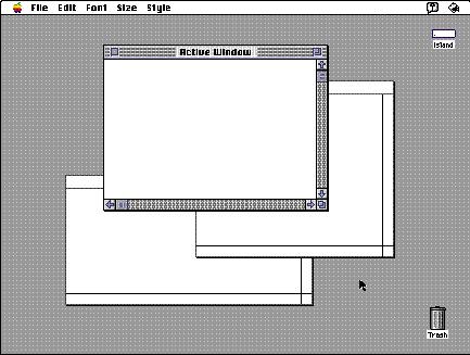Use of Color in WindowsColor distinguishes the active window from other windows and enhances the appearance of user controls on the window frame. On color screens, the scroll bars and the racing stripes in the title bar are gray. The user controls--close box, size box, zoom box, and scroll box--are colored to make them more apparent. The borders of inactive windows are gray and appear to recede into the background so that the active window's black frame emphasizes its position in front of the other windows. Figure 5-3 shows the appearance of windows on a color screen.Figure 5-3 Windows on a color screen