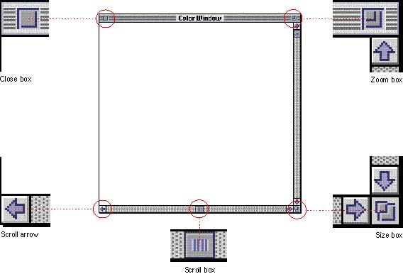 The standard window definition functions display color windows and dialog boxes. The control definition functions for scroll bars, scroll arrows, scroll box, close box, size box, and zoom box have been updated to display these controls in color. If you use the standard window definition functions and standard control definition functions, your application's windows will match the appearance of Macintosh system windows. If you create your own windows, be compatible with the system software appearance by using the standard window color table. Figure 5-4 shows the components of a standard window in color. Figure 5-4 Standard window components in color