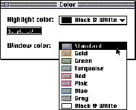 Be aware that users can change the color used in window frames and dialog box frames by using the Color control panel. If you use the standard window color table, you can be sure that any colors you use are consistent with any color that the user can choose from the Color control panel. You can use the Palette Manager to associate a color palette with a window definition. For more information, see the discussion of the Palette Manager in Inside Macintosh. Figure 5-5 shows the Color control panel and the colors that the user can choose to be used in windows and dialog boxes. Figure 5-5 Colors that the user can choose for windows