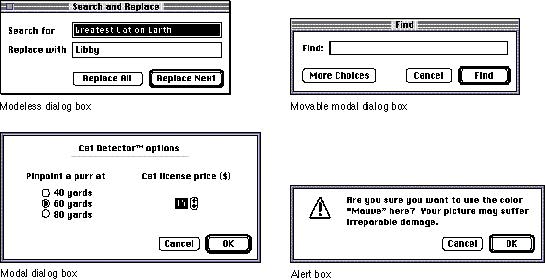 Be aware that users can change the colors of standard dialog boxes by using the Color control panel; this is particularly important if you decide to create custom alert boxes, modeless dialog boxes, movable modal dialog boxes, or modal dialog boxes. If you use the default window color table with your custom window definitions, you can be sure that the colors you use are consistent with any color that the user has access to with the Color control panel. You can use the Palette Manager to associate a color palette with a window definition. For more information, see the discussion of the Palette Manager in Inside Macintosh. Figure 6-1 Examples of dialog box types