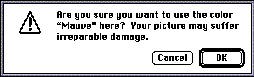 Caution Alert BoxesThe caution alert box is the second level of alert box. It is a more severe alert than the note alert box. The caution alert box icon is the triangle with an exclamation point. Caution alert boxes warn the user in advance of a potentially dangerous action. This kind of feedback provides a safety net for users. Caution alert boxes always contain two buttons, an OK or Continue button and a Cancel button. The caution alert box allows the user to continue the potentially dangerous action or to cancel the action and do something else. The OK or Continue button should be the default button, unless the user has to perform some other task in order to prevent the loss of data. Figure 6-19 shows an example of a caution alert box.Figure 6-19 An example of a caution alert box