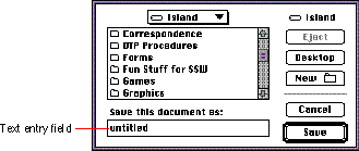 Text Entry FieldsThe text entry field is typically a rectangular box in a dialog box where the user enters some text to identify something. It is also called an editable text field. For example, in the Save As dialog box, the user types in the name of a document. Figure 7-19 shows an example of a text entry field.Figure 7-19 A text entry field