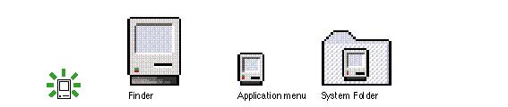 Use Icon Elements ConsistentlyUse icon elements consistently throughout your designs. If there is an existing shape for an icon element, don't change it. For example, don't invent new designs for entities that have a standard design in system-provided icons, such as folders and documents. For example, in Figure 8-16, the icon of the Macintosh computer is the same when it appears in the Finder, in the Application menu, and within the System Folder icon. Unless you are representing a different model of Macintosh computer, use the Macintosh Classic icon to represent the Macintosh computer. People often assume that different shapes have different meanings and may try to read meaning in where none is intended. Users can learn what icon elements represent when they are used consistently.Figure 8-16 Consistent use of icon elements