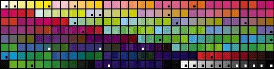 Icon ColorsThis section describes the colors and color techniques that you should use when you design your color icons.The Apple Icon Color SetFigure 8-23 shows a palette of the standard 256 colors with a mark on each of the 34 colors used for icon design in system software. If you use ResEdit version 2.1 or later to design and create your icons, the Finder icon family editor provides easy access to these colors. Choose Apple Icon Colors from the Color menu. This command sets the palette in the editor (which is similar to the palette in most graphics applications) to contain the 34 colors used for Finder icons. See ResEdit Reference for information on using ResEdit.Figure 8-23 Standard 256-color palette with icon colors marked