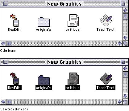 The icon colors were chosen for icon design in system software. It was necessary to limit the number of colors in the set to create consistency Degradation of the Color Set Across MonitorsIf the default color table colors aren't available, the system software gracefully degrades to black and white. First the operating system tries to match 8-bit colors. If it can't successfully match the colors you specify with those inthe system palette, then it displays the 4-bit icon that you supply. If the operating system can't find or match the 4-bit colors, then it displays the icon in black and white. The system software won't substitute colors that aren't visually close to colors that you assigned. If you choose colors other than the 34 marked in Figure 8-23, use them for detail and not for essential parts of your windows or icons. Selection Mechanism for Color IconsWhen a color icon is selected, the color decreases in brightness. Thismeans that the colors appear darker when selected. On a color monitor, a black-and-white icon turns gray when selected. On a black-and-white monitor, a black-and-white icon uses reverse video to show selection. To make selected items appear distinct from unselected ones, use light colors for large areas. Note that only the 34 colors shown in Figure 8-23 get darkened when a color icon is selected. This means that if you use colors other than those 34 colors in large amounts in an icon, that icon will not get darkened and therefore will not look selected. Figure 8-25 shows a set of control panel icons as they appear on the desktop and the same icons in their selected states. Figure 8-25 Color icons and their selected states
