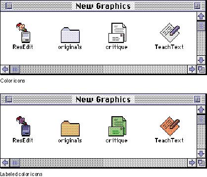 Color Labeling Mechanism for Color IconsThe labeling mechanism tints color icons toward the label color chosen by the user from the Label menu. Figure 8-26 shows some icons and the same icons in their labeled state. To provide system support for this technique, it was necessary to limit the number of colors used in icons. Using the 34 identified icon colors does not guarantee that labeled icons will look good, only that they will actually look labeled. As with icons that are selected, the tinting applies to only the 34 colors. As a result, if you use colors other than the34 colors in your icon, the icon will not look labeled when a label color is applied. Figure 8-26 Color icons and their color-labeled states