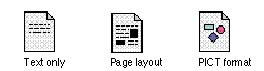 Several conventions exist for conveying document types. You can use these visual clues or others that have meaning for your documents' contents. Documents that are text-only or primarily text use broken lines on the document page. Page layout documents typically include a filled rectangle and broken lines to indicate that the document contains text and pictures. Graphics document icons use geometric shapes or other graphics or graphics tools such as paintbrushes. The standard representation for a file of type 'PICT' is a circle, a square, and a triangle. Use this symbol to indicate files of this type. Figure 8-36 shows document icons with all of these symbols. Figure 8-36 Document icons with standard symbols