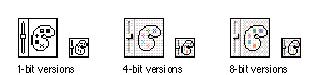 Control Panel IconsThe control panel icon is a square with a slider on it to identify it. The slider also appears on the Control Panels folder. You can add a graphic to the square to customize the icon. You can display the slider in either a horizontal ora vertical orientation. Figure 8-43 shows the icon family for the Color control panel. Figure 8-43 Icons for the Color control panel