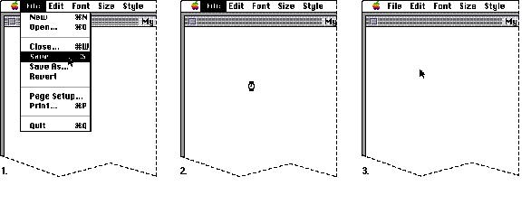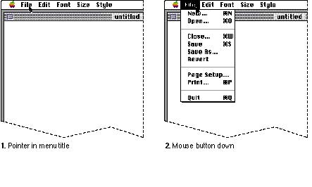 People can look at menus without having to complete any action. To choose a command, the user drags the pointer down the list of menu items, and as the pointer appears over each item, it is highlighted. When the user releases the mouse button while an item is highlighted, the item blinks briefly, the menu disappears, and the operation associated with the menu item runs. You must continue to highlight the menu title until the operation is complete.