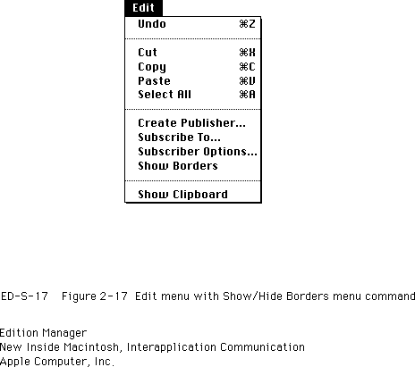 Figure 2-17 displays the Edition Manager Show/Hide Borders menu command in the Edit menu.Figure 2-17 Edit menu with Show/Hide Borders menu command