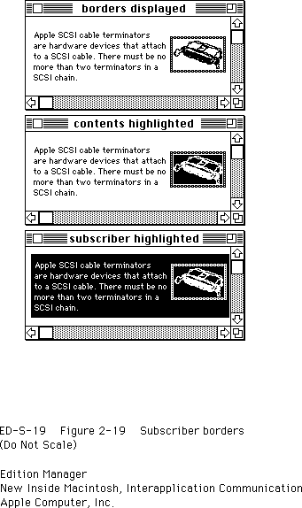 Figure 2-19 shows the recommended border behavior for subscribers. The top window shows a subscriber with its borders displayed. The middle window shows how the borders look when a user selects the contents of a section. The bottom window shows how the borders look when a user selects data within a document that includes a subscriber section.