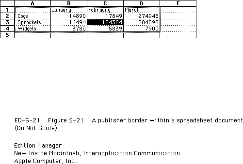 When a user cuts a publisher and its entire contents within a spreadsheet document, the entire section should be held in the scrap. Do not leave an empty publisher border in a spreadsheet (as recommended for text borders). If a user attempts to paste a copy of an existing publisher, you should warn the user by displaying an alert box (see "Duplicating Publishers and Subscribers" on page 2-58).
