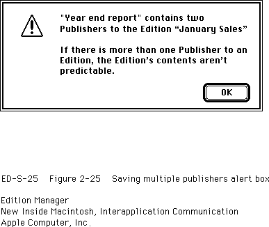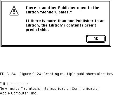 Whenever a user clicks a publisher or subscriber border, you should change the contents of the section to a selected state. You should discourage users from making multiple copies of a publisher and pasting them in the same or other documents, because the contents of the edition would be difficult or impossible to predict. Multiple copies of the same publisher also contain the same control block value. See "Creating and Registering a Section" on page 2-74 for detailed information on control blocks.When a user attempts to create a copy of a publisher that already exists, you should display an alert box such as the one shown in Figure 2-24.