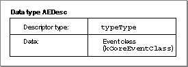 typeType, which specifies that the data handle refers to a four-character code (in this case the constantkCoreEventClass, whose value is'aevt'). This descriptor record can be used in an Apple event attribute that identifies the event class for any Apple event in the Core suite.Figure 3-6 A descriptor record whose data handle refers to event class data