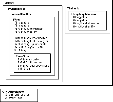 MacApp supplies theTDragDropBehaviorclass as a convenience for setting a view's drag-and-drop fields. TheTDragDropBehaviorclass has four fields that duplicate the identically named view fields:fDraggable,fDroppable,fDragMoveDeterminer, andfDragMoveFamily.When you call