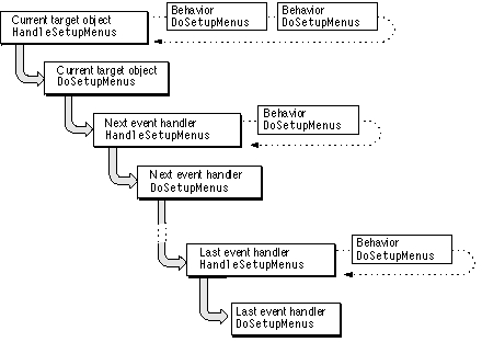 HandleSetupMenusmethod causes theDoSetupMenusmethod to be called for each behavior object and event handler in the target chain, giving each object a chance to enable the menu items it can handle. When this process is finished, only those menu items that can be handled by objects in the current target chain are enabled.Figure 12-1 shows how event-handler objects and behavior objects in the target chain enable menu items.
