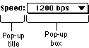 Pop-up menus are useful for presenting a list of choices. For example, you might use a pop-up menu to set the baud rate in a modem-setup dialog box or to choose the line spacing in a word-processing program.A pop-up menu appears as a rectangle with a 1-pixel border and a 1-pixel drop shadow. Pop-up menus are identified by a downward-pointing triangle that appears in the pop-up box. The title of the pop-up menu appears next to the pop-up box. Figure 12-2 shows a simple pop-up menu.