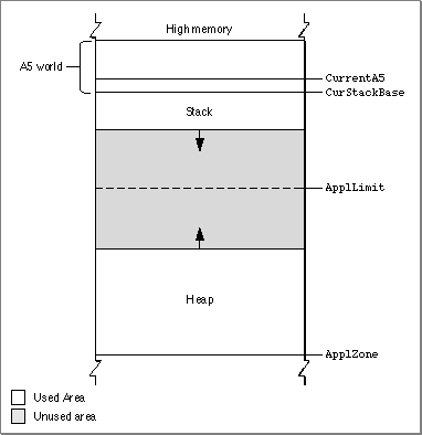 The heap is located at the low-memory end of your application partition and always expands (when necessary) toward high memory. The A5 world is located at the high-memory end of your application partition and is of fixed size. The stack begins