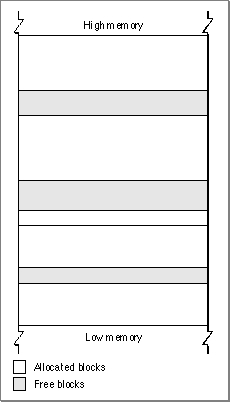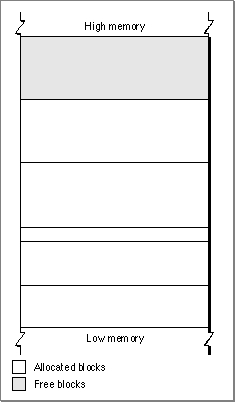 One result of heap fragmentation is that the Memory Manager might not be able to satisfy your application's request to allocate a block of a particular size. Even though there is enough free space available, the space is broken up into blocks smaller than the requested size. When this happens, the Memory Manager tries to create the needed space by moving allocated blocks together, thus collecting the free space in a single larger block. This operation is known as heap compaction. Figure 1-5 shows the results of compacting the fragmented heap shown in Figure 1-4.