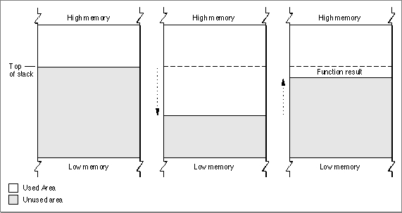 Because of its LIFO nature, the stack is especially useful for memory allocation connected with the execution of functions or procedures. When your application calls a routine, space is automatically allocated on the stack for a stack frame. A stack frame contains the routine's parameters, local variables, and return address. Figure 1-3 illustrates how the stack expands and shrinks during a function call. The leftmost diagram shows the stack just before the function is called. The middle diagram shows the stack expanded to hold the stack frame. Once the function is executed, the local variables and function parameters are popped off the stack. If the function is a Pascal function, all that remains is the previous stack with the function result on top.