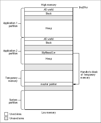 When the Macintosh Operating System starts up, it divides the available RAM into two broad sections. It reserves for itself a zone or partition of memory known as the system partition. The system partition always begins at the lowest addressable byte of memory (memory address 0) and extends upward. The system partition contains a system heap and a set of global variables, described in the next two sections.All memory outside the system partition is available for allocation to applications or other software components. In system software version 7.0 and later (or when MultiFinder is running in system software versions 5.0 and 6.0), the user can have multiple applications open at once. When an application is launched, the Operating System assigns it a section of memory known as its application partition. In general, an application uses only the memory contained in its own application partition.