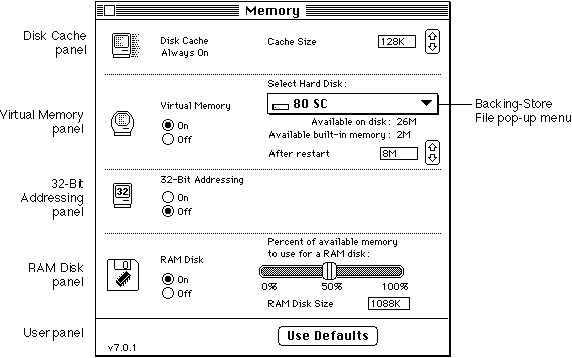 The Virtual Memory panel allows the user to set various features of virtual memory, including whether virtual memory is turned on and, if so, how much is available. The user can also specify the volume of the backing-store file, in which the Virtual Memory Manager stores unused portions of code and data. Changes to the virtual memory configuration do not take effect until the user restarts the computer. Note that the Virtual Memory panel appears only on computers that support virtual memory. For information on how your application can interact with virtual memory, see the chapter "Virtual Memory Manager" in this book.