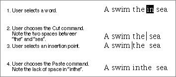 When the user selects text and then chooses the Cut command, or sets the insertion point and then chooses Paste, your application should apply "intelligent cut and paste," that is, discard extra spaces or add spaces, as outlined here. In general, your application should follow these rules to provide intelligent cut and paste: