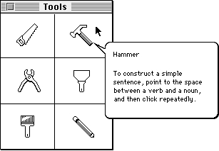 windowKindvalue that matches an'hwin'resource, the Help Manager provides help balloons for the hot rectangles associated with the specified'hrct'and'hdlg'resources.Figure 3-19 shows a sample palette an application might use and the help balloon displayed for the hammer tool.