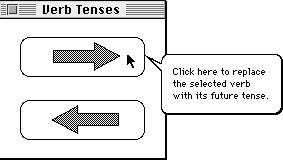 resource 'hwin' (128, "Window help resource", purgeable) { HelpMgrVersion, hmDefaultOptions,/*header component*/ { /*window component*/ 128, /*resource ID of type specified on next line*/ 'hrct', /*resource type for defining help*/ 5, /*length to use when comparing strings*/ "Tools" /*window's title string*/ } }; resource 'hrct' (128, "Tools palette help") { /*header component*/ HelpMgrVersion, hmDefaultOptions, 0, /*balloon definition function*/ 0, /*variation code*/ { /*hot-rectangle component for saw tool goes here*/ /*hot-rectangle component for hammer tool*/ HMStringResItem { {50, 127}, /*tip's coordinates*/ {22,99,54,131}, /*hot rectangle*/ 147,2 /*'STR#' resource ID and index*/ } /*hot-rectangle components for other tools go here*/ } }; resource 'STR#' (147, "Tools palette help text") { { /*[1] saw tool*/ /*help text for saw tool goes here*/ /*[2] hammer tool*/ "Hammer\n\nTo construct a simple sentence, point to the " "space between a verb and a noun, and then click " "repeatedly."; /*help for other tools goes here*/ } };You can also use the'hwin'resource to associate help for items in an alert box or a dialog box. Figure 3-20 shows the Help Manager displaying a help balloon for an item in the dialog box titled Verb Tenses.Figure 3-20 A help balloon for a dialog box with a title