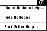 VAR mh: MenuHandle; err: OSErr; BEGIN err := HMGetHelpMenuHandle(mh); IF err = noErr THEN IF mh <> NIL THEN BEGIN AppendMenu(mh, 'SurfWriter Help...'); END; DrawMenuBar; END;Be sure to use an'hmnu'resource to provide help balloons for items you've added to the Help menu. Use thekHMHelpMenuIDconstant (-16490) to specify the'hmnu'resource ID. After the header component of the'hmnu'resource, provide a missing-items component and then the components for your appended items. You don't provide a menu-title component here; instead, the Help Manager automatically creates the help balloons for the Help menu title and the standard Help menu items. The Help Manager also automatically adds a divider line between the end of the standard Help menu items and your appended items.Listing 3-19 shows an