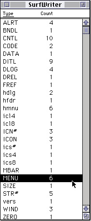 You typically define the user interface elements of your application, such as menus, windows, dialog boxes, and controls, by specifying descriptions of these elements in resources. You can then use Menu Manager, Window Manager, Dialog Manager, or Control Manager routines to create these elements--based on their resource descriptions--as needed. You can create resource descriptions using a resource editor, such as ResEdit, which lets you create the resources in a visual manner; or you can provide a textual, formal description of resources in a file and then use a resource compiler, such as Rez, to compile the description into a resource. Figure 1-5 shows the window ResEdit displays for the SurfWriter application. This window lists all of the resources in the resource fork of the SurfWriter application.Figure 1-5 The ResEdit window for the SurfWriter application