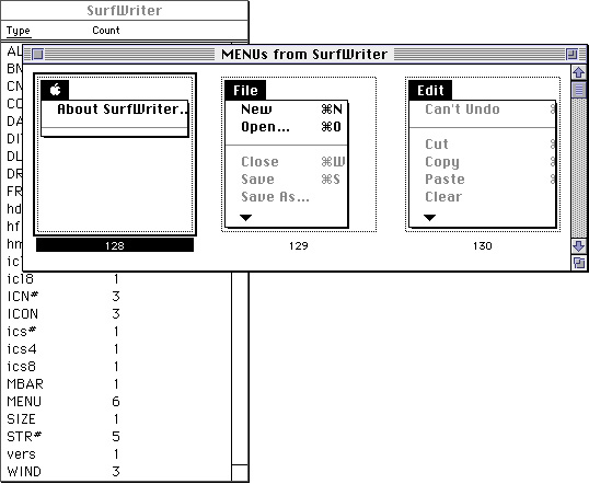'MENU'resources, double-click that resource in the ResEdit window. Figure 1-6 shows how ResEdit displays the menus of the SurfWriter application.Figure 1-6 The menus of the SurfWriter application