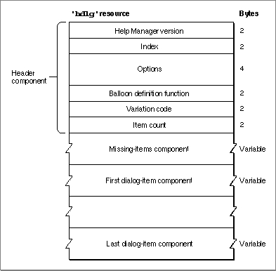 'hdlg'resource. Then a variable number of dialog-item components are stored in this resource. The Help Manager determines the end of the'hdlg'resource by using the item count information in the header component. The Help Manager determines the type of each component by its order in the resource.The structures of the missing-items component and the dialog-item components depend on identifiers specified inside the components. The identifiers used in a Rez input file are described in "Specifying the Format for Help Messages" on page 3-21.