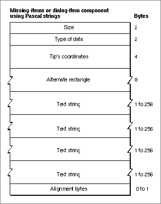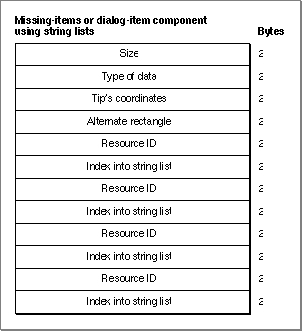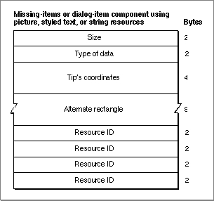 'hdlg'resource consists of a header component, a missing-items component, and a variable number of dialog-item components. Figure 3-30 shows the general structure of a compiled'hdlg'resource.Figure 3-30 Structure of a compiled dialog-item help (