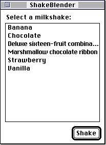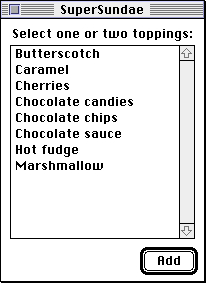 List Manager truncates the string displayed and appends an ellipsis to it. Both of these techniques are illustrated in Figure 4-1. Both the strings "Deluxe sixteen-fruit combination" and "Marshmallow chocolate ribbon" are condensed; the first of these is also truncated.Lists may contain a vertical scroll bar, a horizontal scroll bar, or both. By using scroll bars, you can include more items in a list than can fit in the list's rectangle, and the user can scroll to view multiple items. If there is any chance that a list may contain more cells than can fit within the list's rectangle, you should include a scroll bar in the list.
