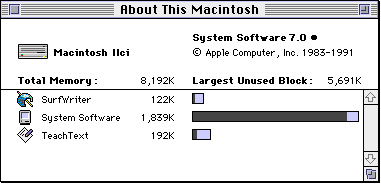 'LDEF'that defines the characteristics of a list. In addition to using a list definition procedure to support graphical items in lists, you can write one to customize the display of text in a list. For example, to use styled text in a list, you would need to create a list definition procedure.You can also use a list definition procedure to create lists that contain cells which display more than one type of information. For example, the Finder's "About This Macintosh" modeless dialog box contains a list of applications that are currently in use. Each cell in the list includes a small icon of the application, the name of the application, the amount of memory in the application's partition, and a graphical indication of how much of that memory has been used, as illustrated in Figure 4-6.