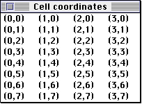 TYPE Cell = Point;TheCelldata type has the same structure as thePointdata type; however, the fields (horizontal and vertical coordinates) of a cell record have different meaning. The horizontal coordinate of a cell specifies its column number, and the vertical coordinate of a cell specifies the cell's row number. Note, however, that the first cell in a list is defined to be cell (0,0). So a cell with coordinates (3,4) is in the fourth column and fifth row. Thus you can visually identify a cell's coordinates using the formula (column-1, row-1).
